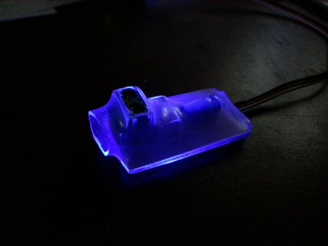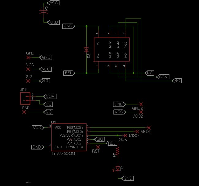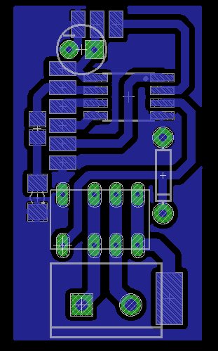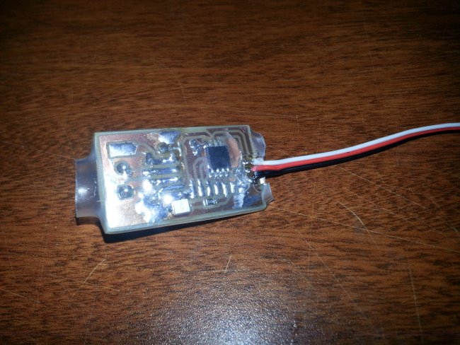 So how does it work? Well, let’s start with the switching. The white component on the board is actually a very small, low power relay. I have it wired in so that when there’s no power to the board, it shorts out the engine and stops it. This is so that if the plane loses power in flight, it won’t run out of control. The other major component on the board it the microcontroller. I used a surface mount attiny85. This chip reads the radio signal coming from your receiver and switches the relay on only when it gets a valid signal. There’s also a blue led on the bottom to indicate when your engine is “hot”.