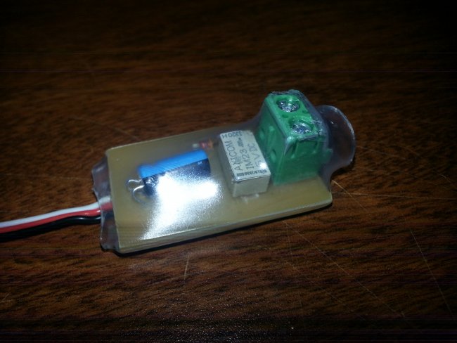 Thought I’d share what I’ve been working on lately. Recently, the club I fly at made it a rule that you must be able to kill your engine remotely; choking the engine to kill it was deemed unreliable and dangerous. This means that ignition to the engine must completely stop on demand. For most guys who use electronic ignition systems, this is no problem. However, the engine that I’m planning to use has a magneto ignition. This means that a magnet attached to the flywheel passes by a coil to generate the electricity for the spark. This ignition is particularly hard to stop because as long as the engine is spinning, sparks will continuously be created. Luckily the magneto on my engine has a wire that when grounded to the case of the engine will short out the sparks and effectively kill the engine. So, all I had to do after I figured this out was create a device that shorts this wire to the case whenever it loses power or signal. Here’s the final product: