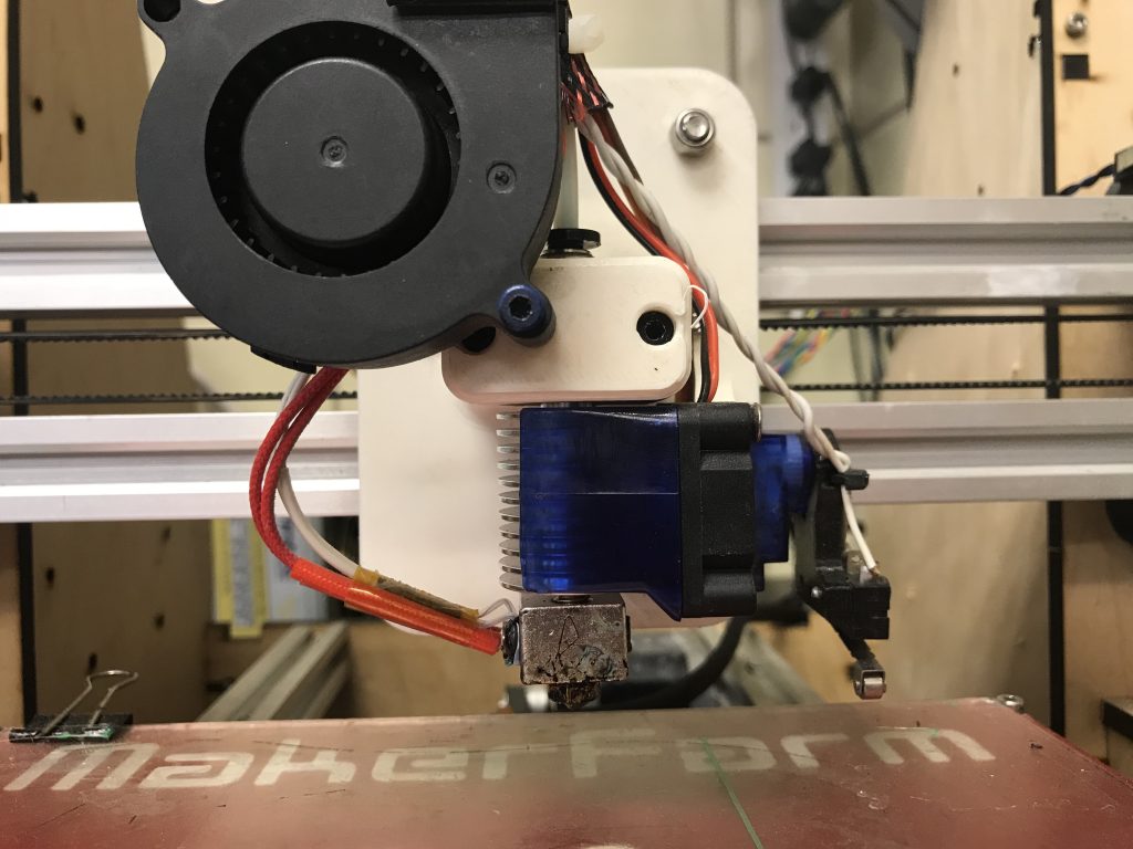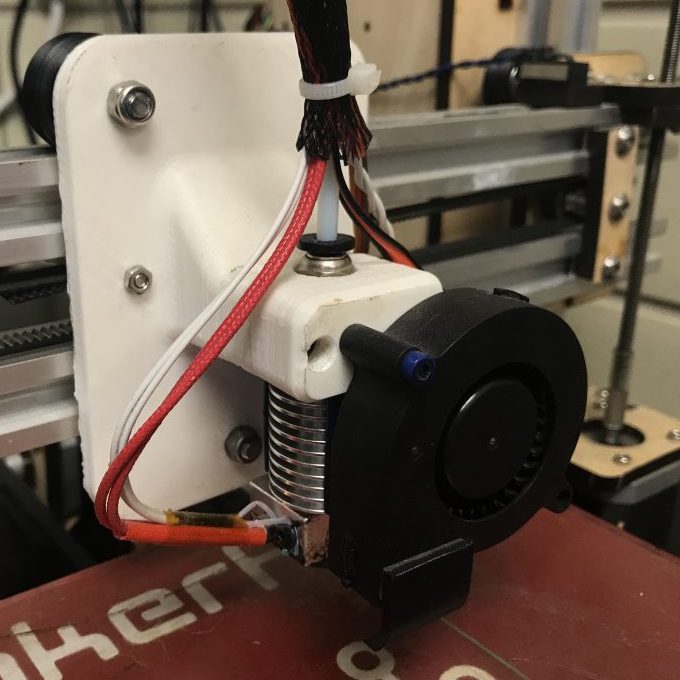 I chose to use the popular E3D v6 1.75mm extruder with Bowden tube. I also purchased a small blower fan instead of the axial fan that was originally on the printer. Finally, I added a small 9 gram servo and microswitch for bed leveling. All of these parts were mounted on a new X carriage that I designed and printed.