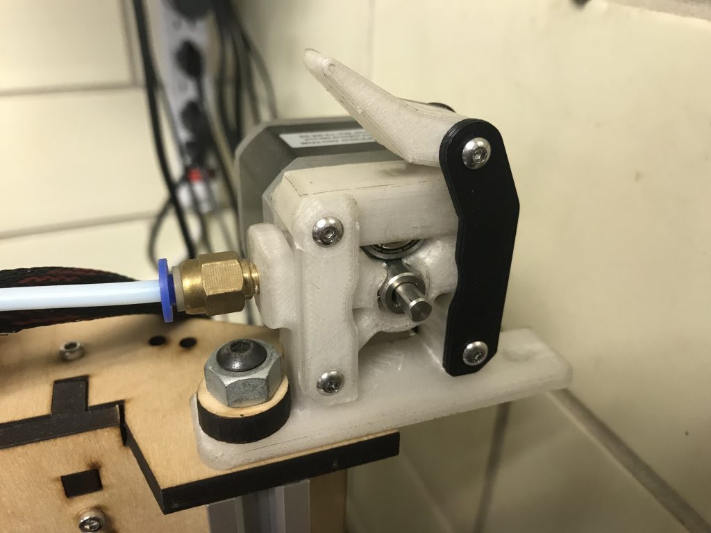 The filament drive is mounted on top of the printer. I used a design I found on Thingiverse