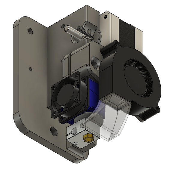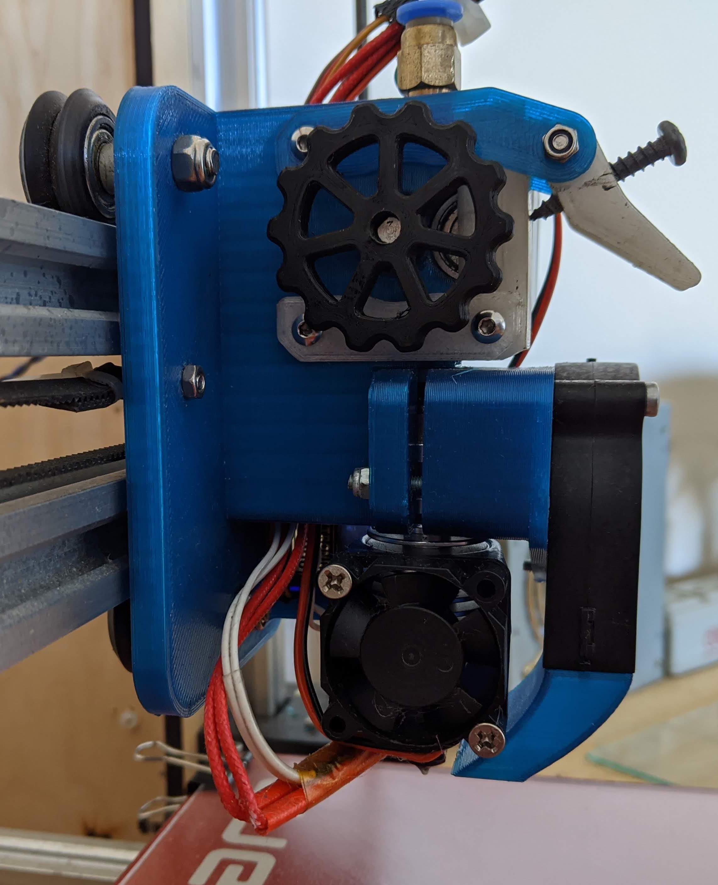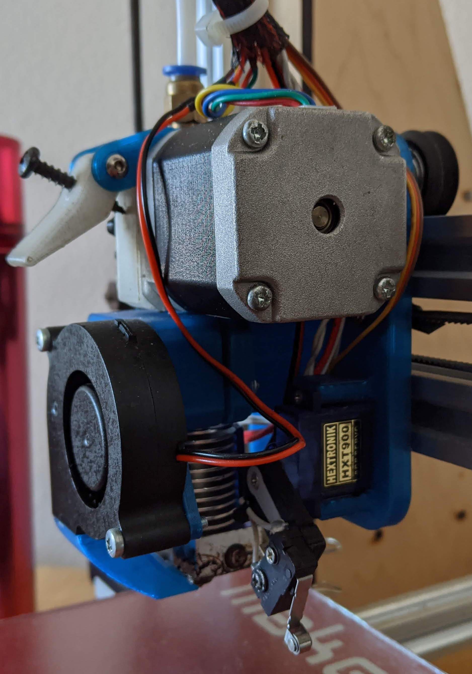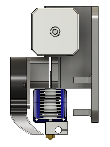 I was a huge fan of the VORON extruder though. It allowed fast filament changes and handled flexibles perfectly. I also felt that my previous design for the X carriage with integrated E3D hotend and bed leveling servo mount was working just fine. So, I decided to merge these two deigns into one. The result can be seen in the Fusion 360 mockup and photos below: