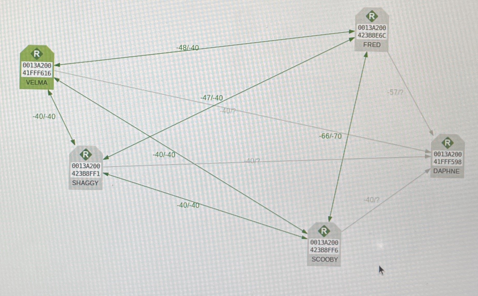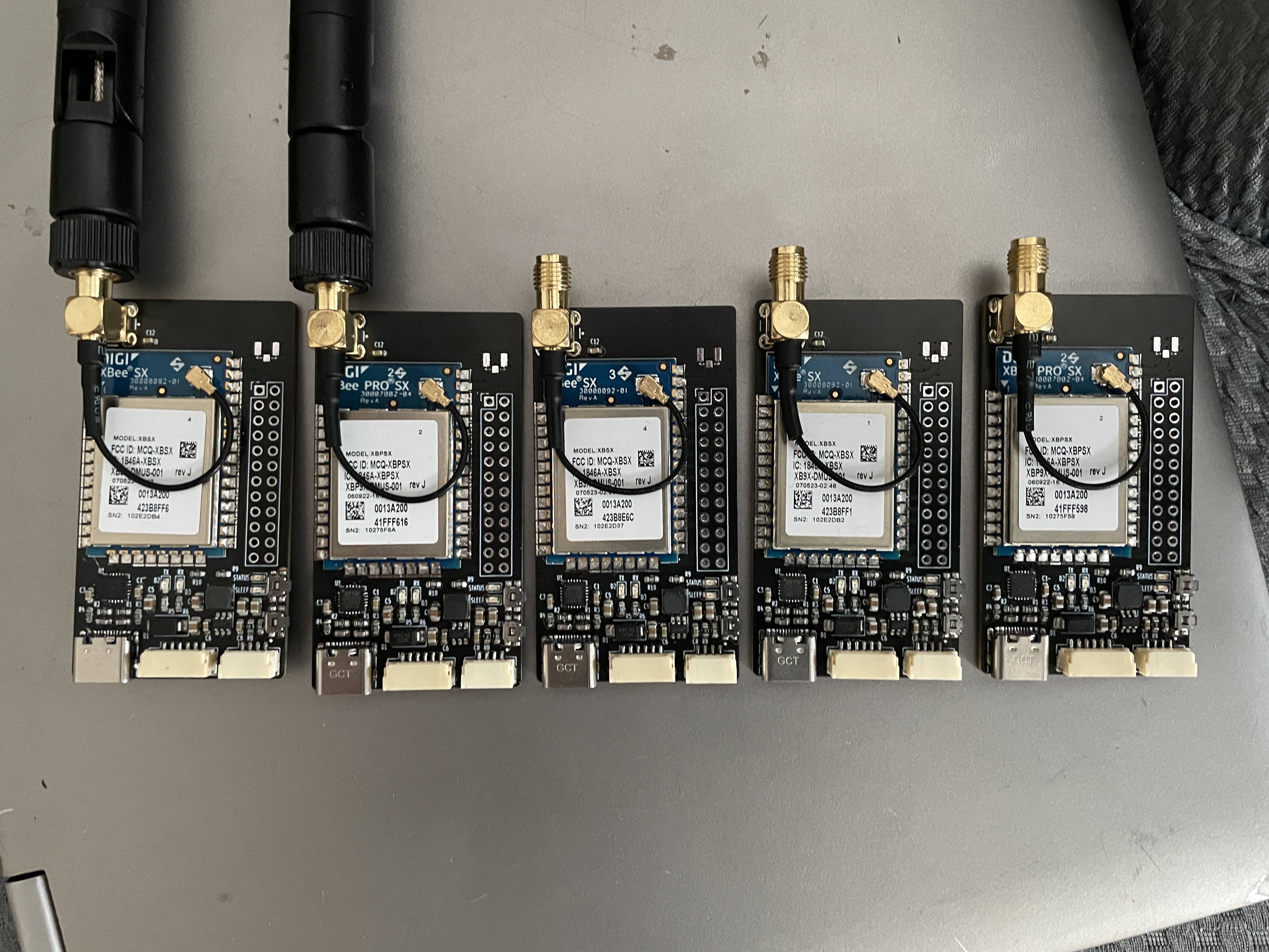 All 5 of my prototypes operating in a mesh configuration. Will be exploring more complicated topology scenarios in the future